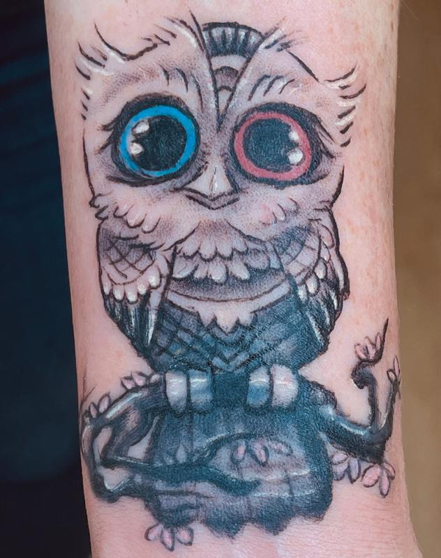 black and grey illustrative owl with colored eyes black and red like 3D glasses